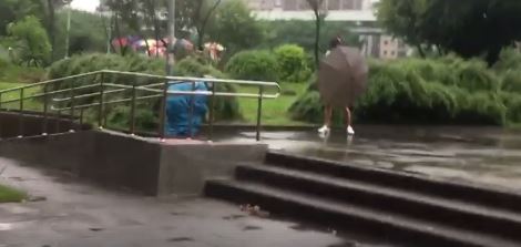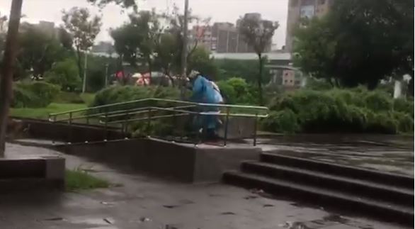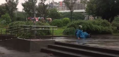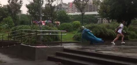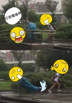 女子退了一步準備離開,想不到男子還不肯放過,張牙舞爪的衝向女子又想攻擊她,卻因為天雨路滑,竟來個「花式滑壘」,跌了狗吃屎,十分搞笑。這時女子已經趁機逃跑,雨衣男才默默爬起,一下扶著疼痛的雙手,一下摸著屁股,「默默
