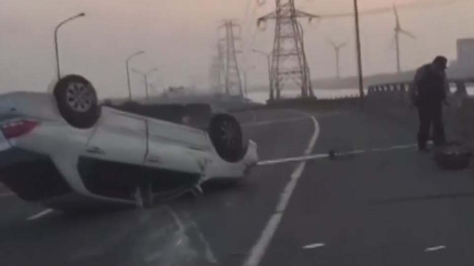 ,再失控翻車,四輪朝天。但警消趕到現場,卻沒看到