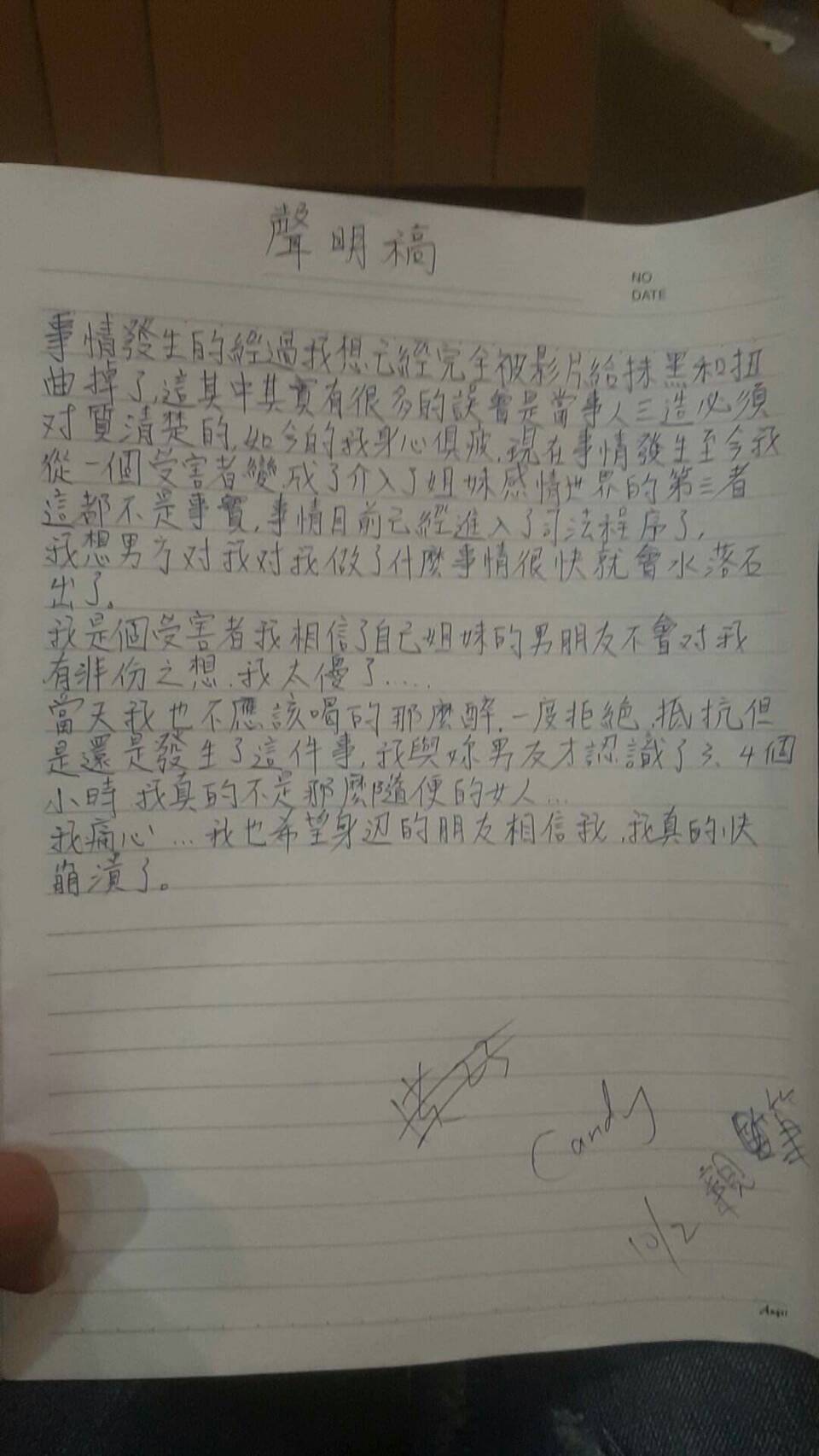 Candy在聲明稿中指出,「如今的我身心俱疲,現在事情發生至今,我從一個受害者變成了介入姐妹感情世界的第三者,這都不是事實」。她說明,自己和妮妮男友才認識了3、4個小時,她不是那麼隨便的人,並表示自己當天喝得太醉了,雖然一度拒絕、抵抗,卻還是被迫發生性關係,不過她強調自己是受害者,「我相信了自己姐妹的男朋友不會對我有非份之想,我太傻了」,並呼籲神隱的男方快出面和她對峙,不要再作賊心虛,「我痛心…我也希望身邊的朋友相信我,我真的快崩潰了。」
