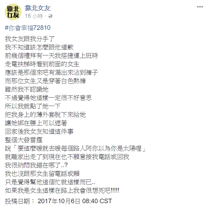 靠北女友」發文表示,女友向他提分手,自己卻不知道該如何道歉,原由是前幾個禮拜他在捷運手扶梯,看到前面的女生疑似「那個來」沾到白色熱褲,雖然自己不認識她,「不過覺得她這樣一定很不好意思」,於是將自己身上的薄外套脫下來給女子,「讓她綁在腰上可以遮著」,想不到女友知道這件事後大發雷霆,還直嗆「要這麼暖就去暖每個路人阿!你以為你是太陽喔」,發文網友很納悶「我錯在哪了」,解釋自己並沒有向女路人留電話或Line,純粹是出於善意想幫忙,「如果我是女生這樣在路上我會很想死吧」。