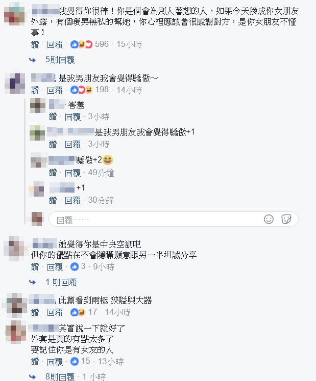 不過有網友持分歧意見,認為「其實說一下就好了,外套是真的有點太多了,要記住你是有女友的人」、「是我也會不開心,因為你對別人也這麼暖……」,也有網友笑說「錯在你太老實了,下次就默默行善吧」。