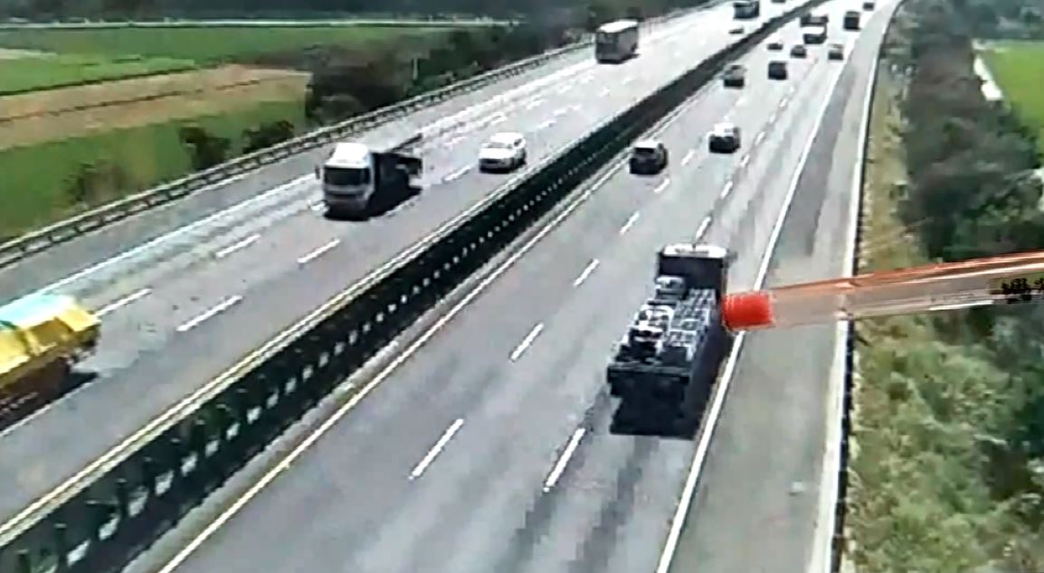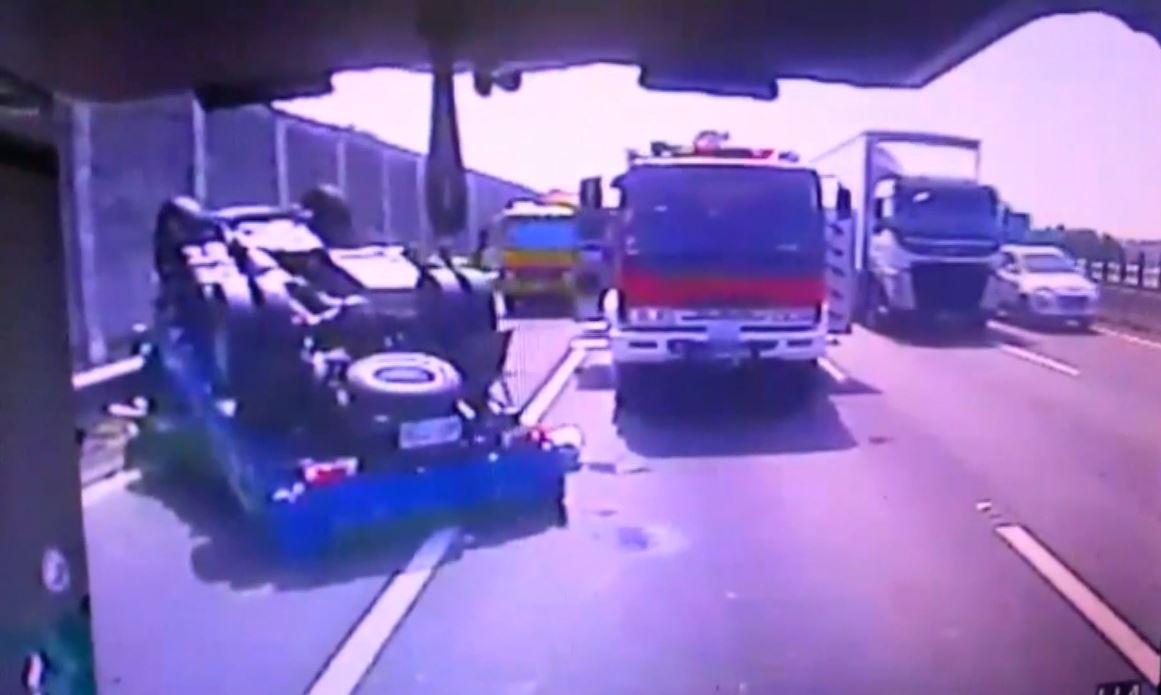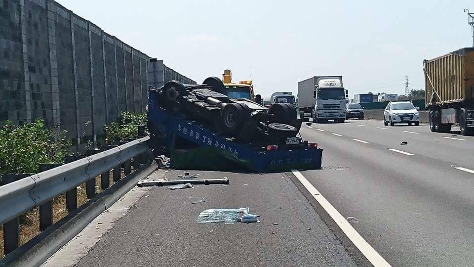 鑄鐵塊掉落後,一輛在後方的拖板車閃避不及,碾壓過去爆胎,車速慢了下來,不過這一碾壓,鑄鐵塊竟從南下車道彈飛到北上車道,先飛撞一輛白色自小客車,掉落地面後,曹姓駕駛開的小貨車躲不過就撞上去,結果造成車子失控翻覆。