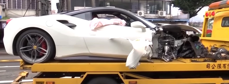 法拉利488GTB,疑似因駕駛不熟路況,天雨路滑自撞護欄,由於衝擊力過大,車頭面目全非,引擎蓋完全掀開,車身也嚴重變形,所幸車上駕駛和乘客無任何大礙,無波及其他用路車輛,初估維修費百萬元起跳,但離奇的是肇事者卻在案發後,棄車逃離現場。