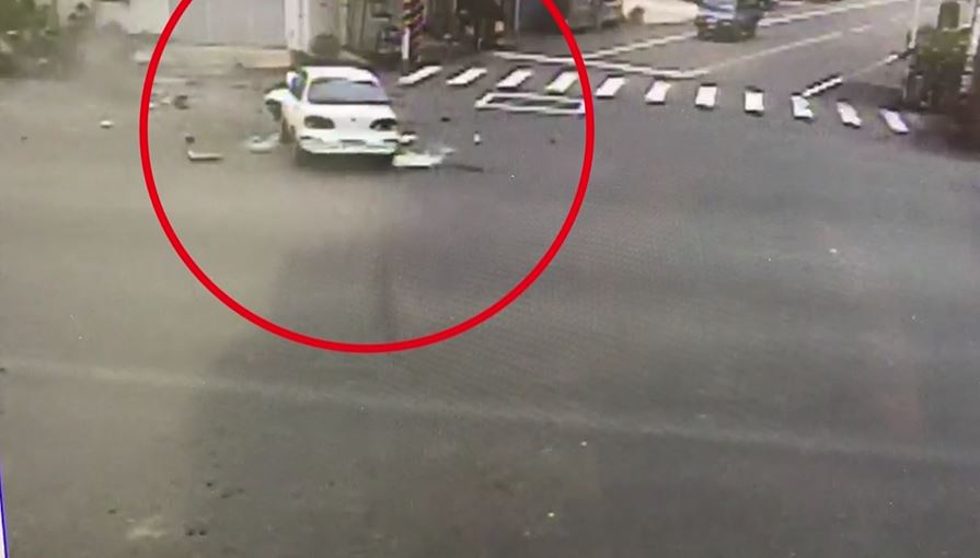 曝光的監視畫面中,白色的小客車開到路口往左邊靠後,下一秒立刻迴轉,這時一輛重機直直行駛而來對撞而上,重大的撞擊將重機騎士撞到拋飛,重機則滑移到附近花圃嚴重損毀,小客車的車頭則被撞凹一個大洞,零件瞬間散落一地,而命大的騎士則恰巧掉落在前方一輛正在行駛中的工程車上。