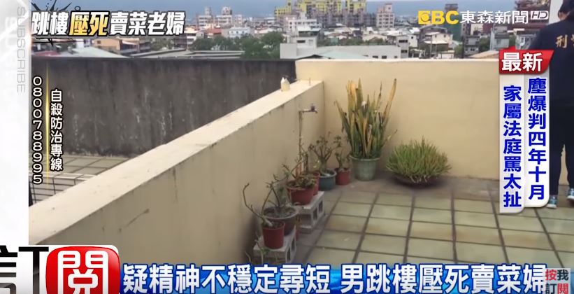 輕生的林姓男子過去經營印刷店生意,長期罹患憂鬱症,去年4月26日,林男爬到隔壁鄰居7樓處往下跳,竟不偏不倚落在騎樓下方賣菜的陳姓老婦身上,陳婦到院時已失去呼吸心跳,最後身亡,林男經急救過後也宣告不治。