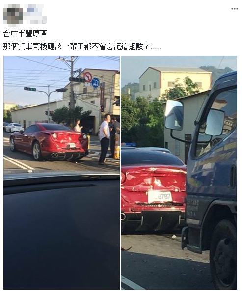 好貴的一場車禍!台中豐原區豐原大道一段,發生了一起小貨車追撞千萬法拉利的車禍,由於撞擊力道強大,法拉利的車尾嚴重凹陷,受損非常嚴重,小貨車駕駛深怕自己根本賠不起,但網友卻紛紛歪樓,直呼「牌號太強大了!」