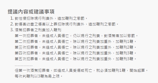 台灣近年來酒駕、性侵或是虐童案件層出不窮,許多人認為應該要以更嚴厲的懲罰來遏止犯罪,因此有民眾在國發會的公共政策網路參與平台提案,針對酒駕累犯、性侵犯及對幼童傷害等增設刑法懲罰方式,還提議增加「