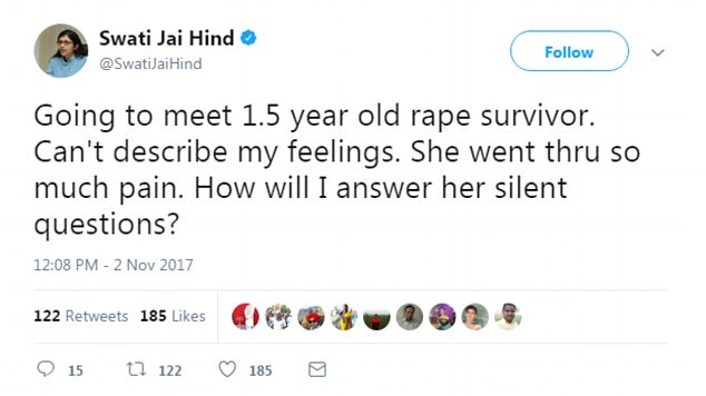▼德里婦女委員會主席默利沃(Swati Maliwal)探望女嬰之前在推特PO文。圖/推特