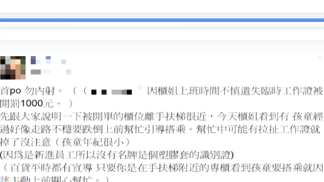 這家位在台南的百貨公司,一、二、三樓已經是同一家大型的專櫃來經營,而爆料的櫃姐就指,她因為剛到職,所以身上戴的,是用紙印出來的臨時工作證,裝在簡單的塑膠套裡,而她在幫忙引導搭手扶梯的幼童時,不小心遺失了工作證,她告訴樓管,樓管卻沒有調監視畫面幫忙找,而要求她在下班前找到,否則就開罰。
