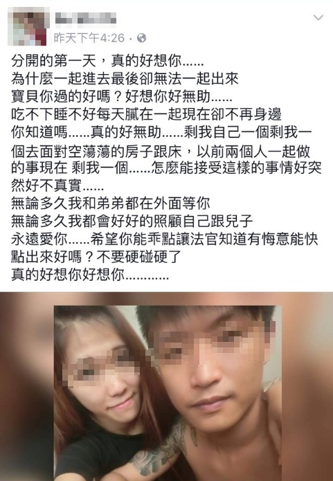 蘇女返家後,相當思念遭羈押丈夫,在臉書寫下「分開第一天、真的好想你…」、「吃不下、睡不好,每天膩在一起,現在卻不在我身邊!」文中滿是思念,蘇女還在文中教戰,希望丈夫乖一點才有機會早日出獄,「希望你能乖點,讓法官知道有悔意,能快點出來好嗎?不要再硬碰硬了!」