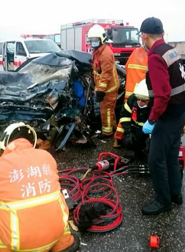 據了解,澎湖縣白沙鄉昨日為了配合2017遠航馬拉松賽事的進行,特地在中正橋撥出一線道做為賽道,從原本的4線道縮減成3線道,意外發生當下,30歲陳男駕駛的小貨車逆向行駛而來,鍾婦因為道路縮減所以無處可閃,被硬生生地迎面撞上,而肇事的陳男車上載滿國小營養午餐,正準備趕去北海碼頭送往貝吉國小,疑似因為搶快所以跨越雙黃線,不慎失控衝進對向車道,撞擊力道大到兩車車頭全毀,食物也飛濺滿地,現場一片狼籍。