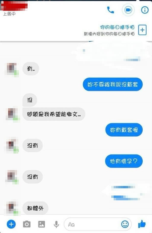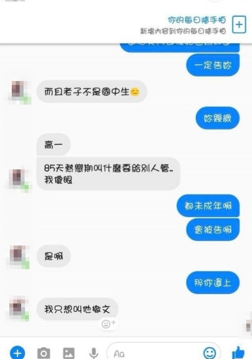 此外,有網友貼出與該名男高中生的對話截圖,他警告男高中生「未成年會被告」,男高中生表示自己知道,但現在只想要《爆廢公社》撤文,網友還質疑男高中生是否有讓女方懷孕,想不到男高中生竟回嗆「85天熱戀期叫什麼要給別人管?我傻眼」,還語出驚人透露自己「沒戴(保險套)」,讓網友嚇傻趕緊追問「女生有懷孕嗎」,對此,他更理直氣壯地辯駁「沒有,都體外」。