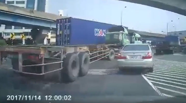 據《ETnews》報導,高雄市前鎮警方表示,聯結車因為轉彎幅度較大,且銀色轎車所處的位子剛好位於視覺死角,因此才會發生這起事故,所幸沒有人員傷亡,不過銀色轎車車殼完全被擠爆,且插隊當下已經違規跨越了槽化線,警方將依法處以900元至1800元罰單。