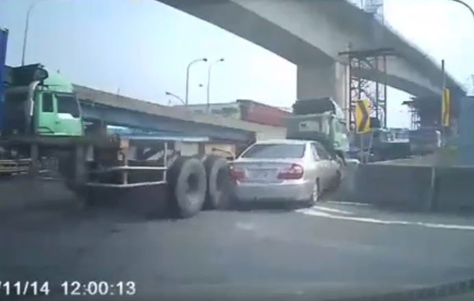 聯結車因為車身長且體積大,很容易產生視線死角或內輪差,因此許多駕駛都會特意和聯結車保持安全距離,不過有網友PO出一段影片,表示有輛銀色轎車沒乖乖排隊,硬要穿越縫隙