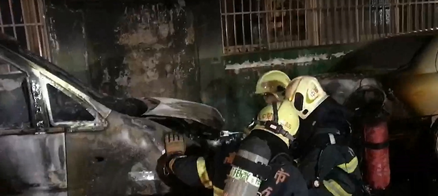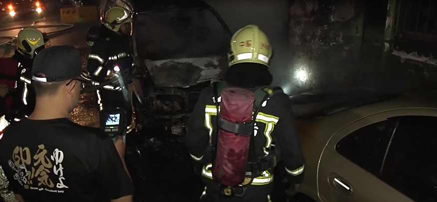大火來的突然,火勢也一度波及附近車輛,幸好消防車迅速將火勢撲滅,除了著火的廂型車前半部幾乎全毀外,停在兩台車中間的摩托車幾乎被燒到難以辨認,而廂型車前方的小轎車也很慘,車主被通知來現場後,看到自己愛車被燒到這副模樣則是當場傻眼。