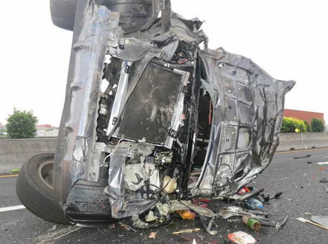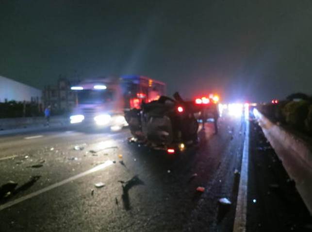 國道。由陳姓婦人駕駛的自小客車,先是遭到追撞後翻覆,人爬出車外,竟被後方閃避不及的