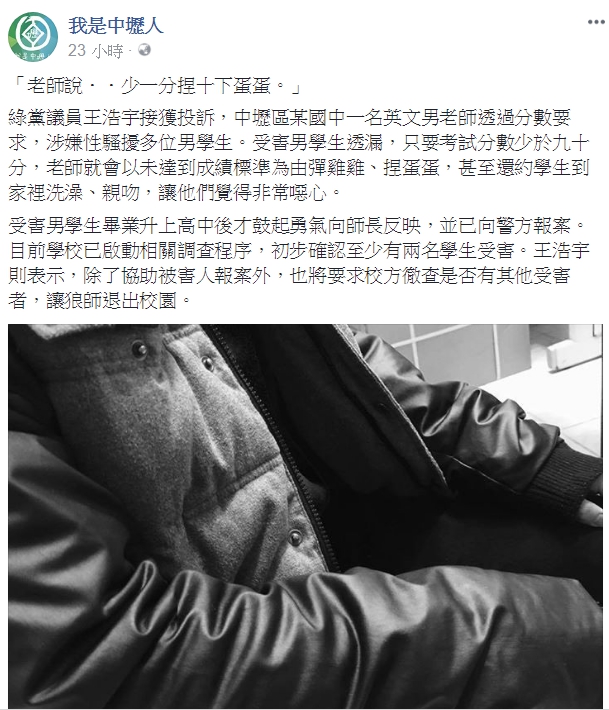 臉書「我是中壢人」昨(5日)PO文表示,綠黨議員王浩宇接獲投訴,中壢某國中英文代課陳姓男老師,竟以未達成績標準為由,彈男學生生殖器,還有受害學生透露,只要考試分數低於90分,「少1分