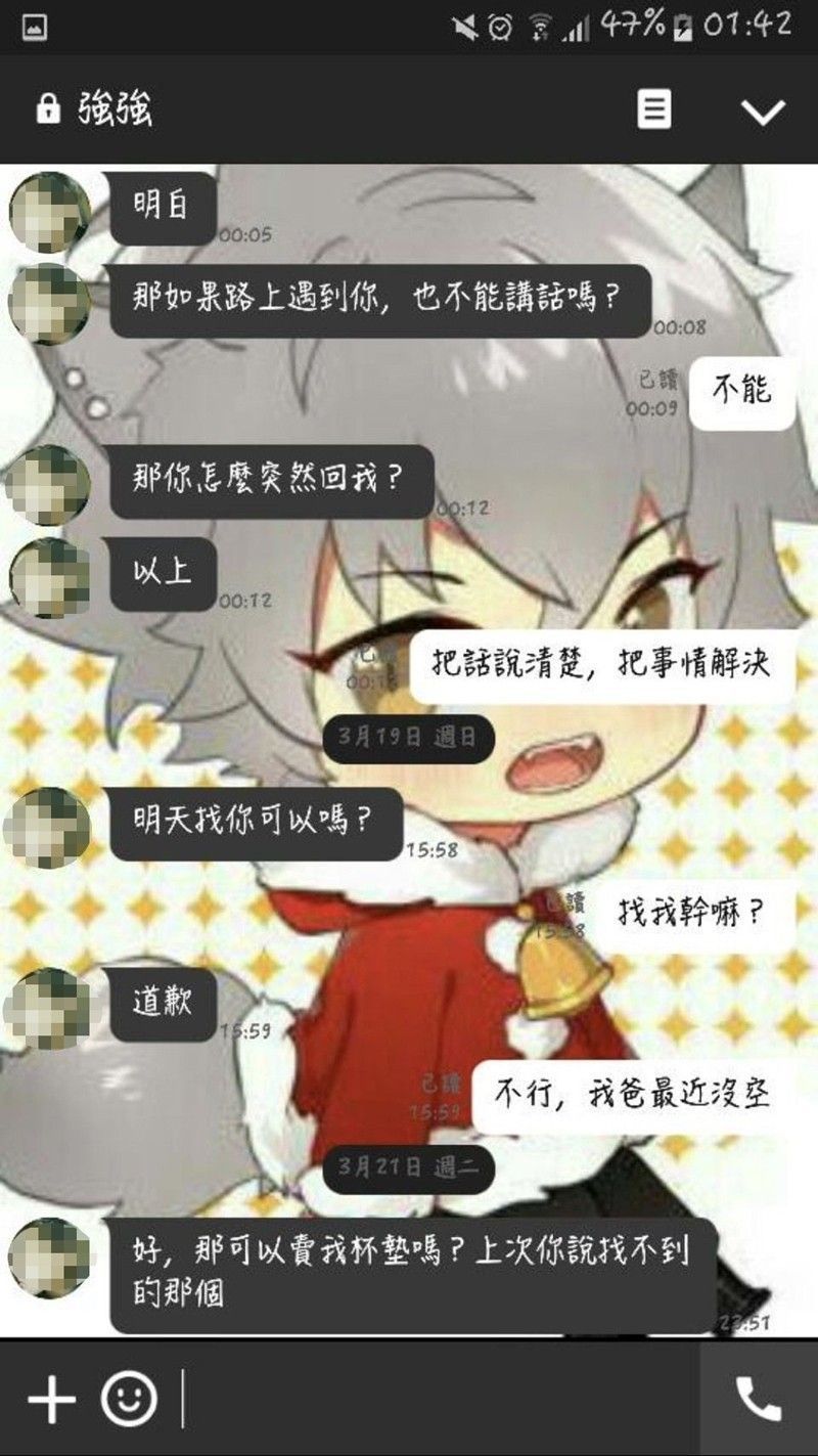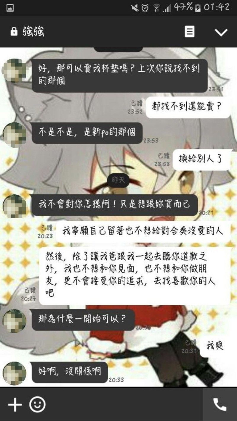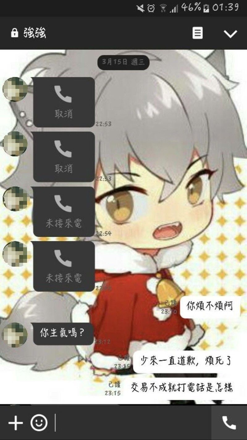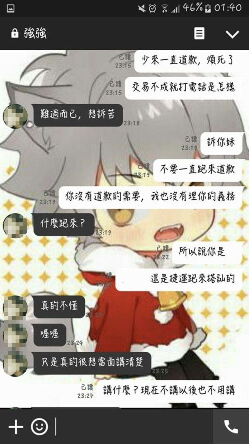 從LINE對話截圖可以看到,石女將陳男稱為「強強」,可見其厭惡程度。陳男原本透過臉書向石女購買動漫商品,想藉此套關係或是搭上話,但石女基於安全考量打太極拒絕,字字句句都充滿了憤怒情緒,陳男卻一直盧,甚至到了死纏爛打的地步,奪命連環call給陳女,說「難過而已,想訴苦」、「只是真的很想當面講清楚」、「對不起,我只是期待妳接而已」。