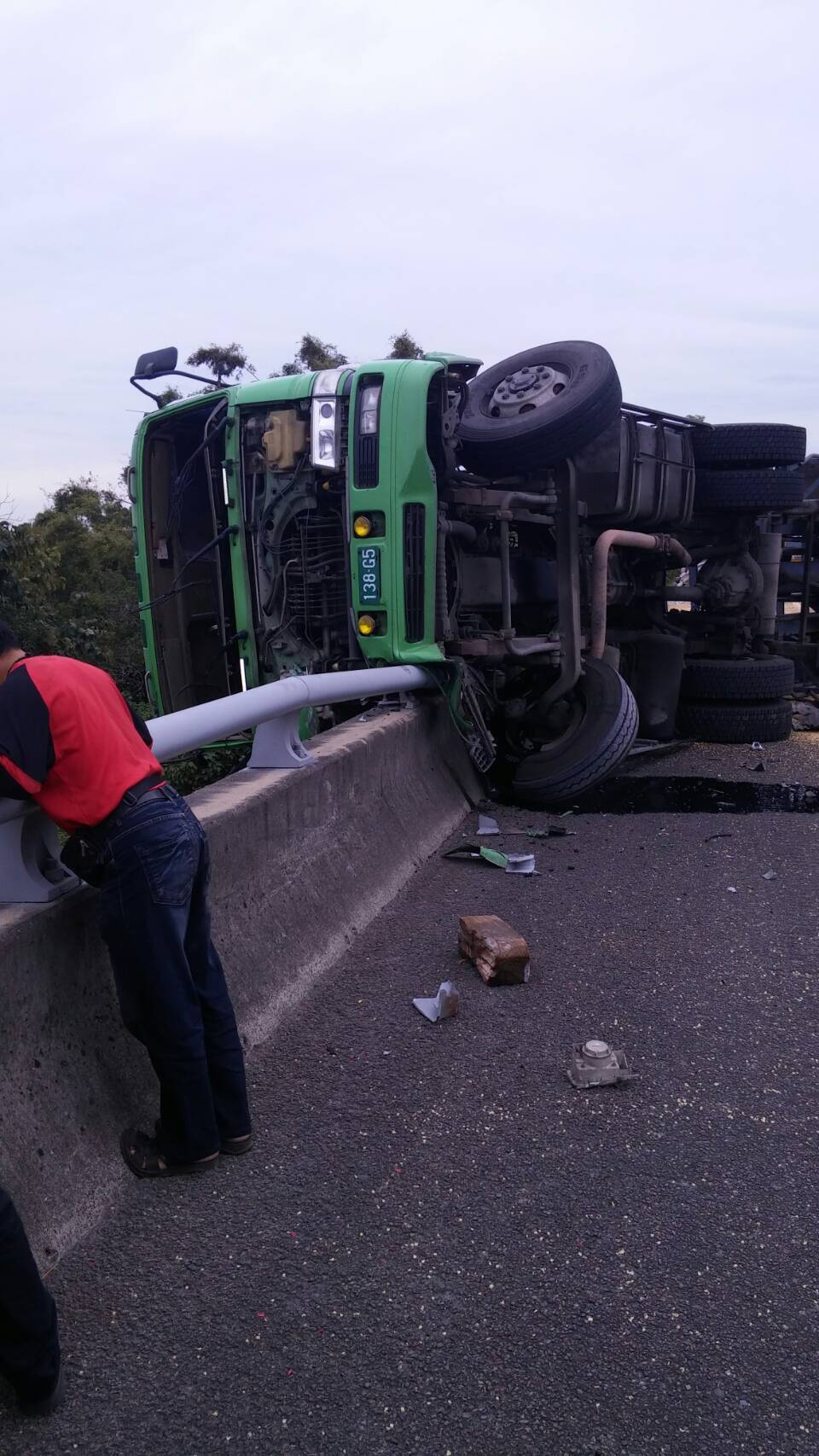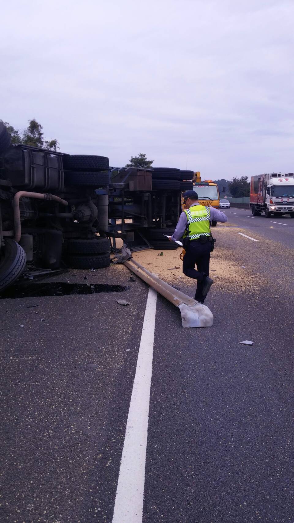國道3號北上351.5公里處,因不明原因自撞護欄,大卡車翻覆,導致車頭懸16米國道高空損毀,車上的玉米粒也散落一地,消防隊獲報出動一度找不到司機,最後發現司機已無呼吸心跳,確切肇事原因仍待調查。