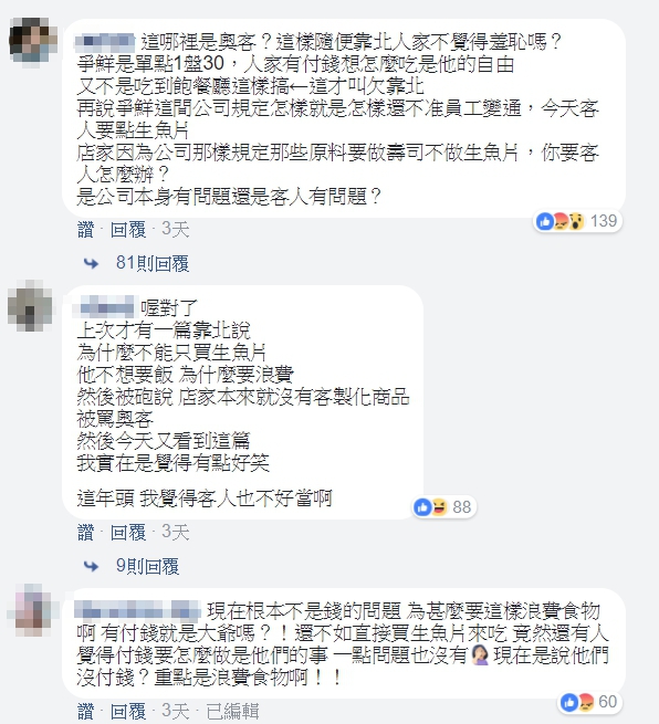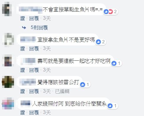 但還是有不少網友看了文章,支持原PO的想法,痛批「浪費食物會有報應!」、「好好的食物浪費真的是很可惡啊」、「不要吃飯幹嘛不直接吃生魚片就好」、「覺得應該被雷公打」、「為甚麼要這樣浪費食物啊?有付錢就是大爺嗎?」、「種田農夫很辛苦,我們應該珍惜食物」、「付錢了錢,想怎麼吃就怎麼吃,但是不應該浪費食物,資源有限,這世界還有多少人沒有飯吃!」、「浪費食物比奧客還爛」。