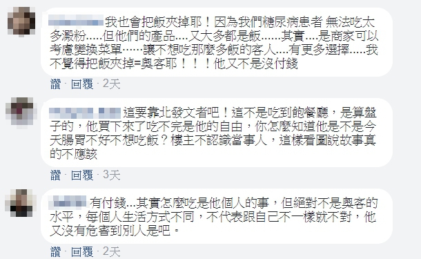 和原PO持反面想法的網友紛紛留言,「人家有付錢,想怎麼吃是他的自由,又不是吃到飽餐廳這樣搞,這才叫欠罵」、「你怎麼知道他是不是今天腸胃不好不想吃飯?樓主不認識當事人,這樣看圖說故事真的不應該」、「其實他就浪費而已,沒礙到他人,我覺得還好」、「人家錢照付,到底跟你什麼關係」。