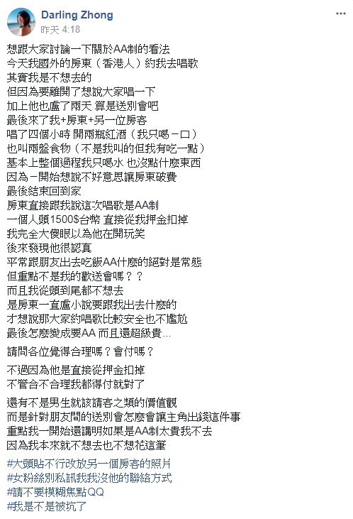 女網友還表示,一到場,香港房東立刻開了兩瓶紅酒,也叫了兩盤食物。過程中她喝酒只喝一口,食物也只吃一點,只有喝水,認為不好意思讓房東破費,沒想到結束後,竟被對方告知這次唱歌屬於AA制,要付1500元台幣,會直接從她押金扣除掉,女網友感到非常困惑「我完全大傻眼,以為他在開玩笑,後來發現他很認真」