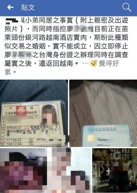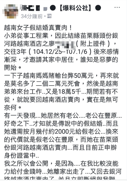 陳男9日在臉書《爆料公社》等社團上PO出「越南女子假結婚真賣肉!」的貼文,並表示自己從事工程業,過去因為應酬的關係,認識了在苗栗縣頭份市銀河路酒店上班的廖姓越籍女子,兩人之後展開交往。