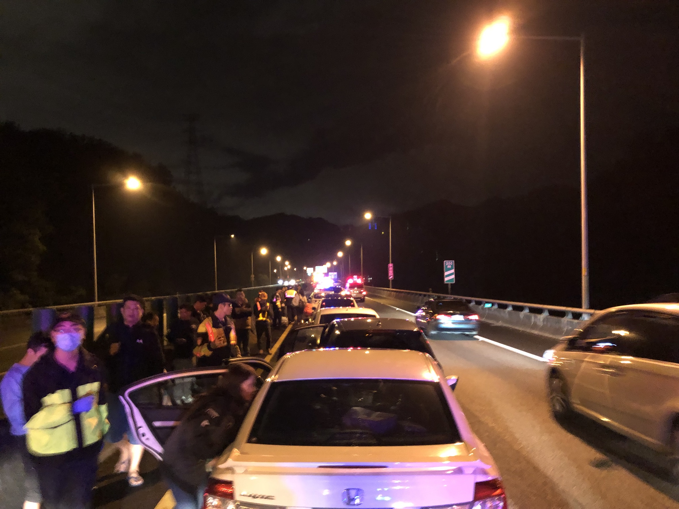 ,一共2名乘客輕傷,兩名乘客受到驚嚇,所幸沒有人受困車內,目前交通方面,則影響內側車道,剩下外側車道可以通行,造成嚴重塞車,提醒民眾提早繞道。