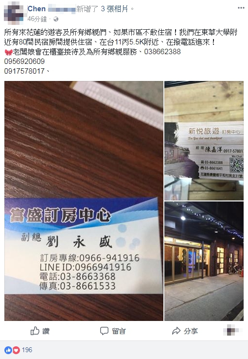 位於東華大學附近的民宿業者,在臉書貼出訂房訊息,讓不敢住在市區的民眾免費居住。