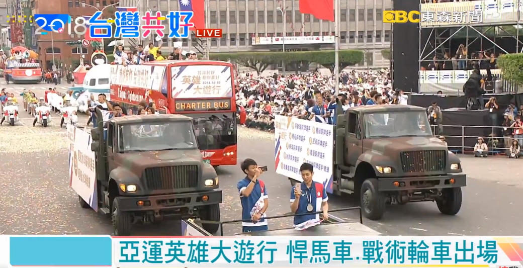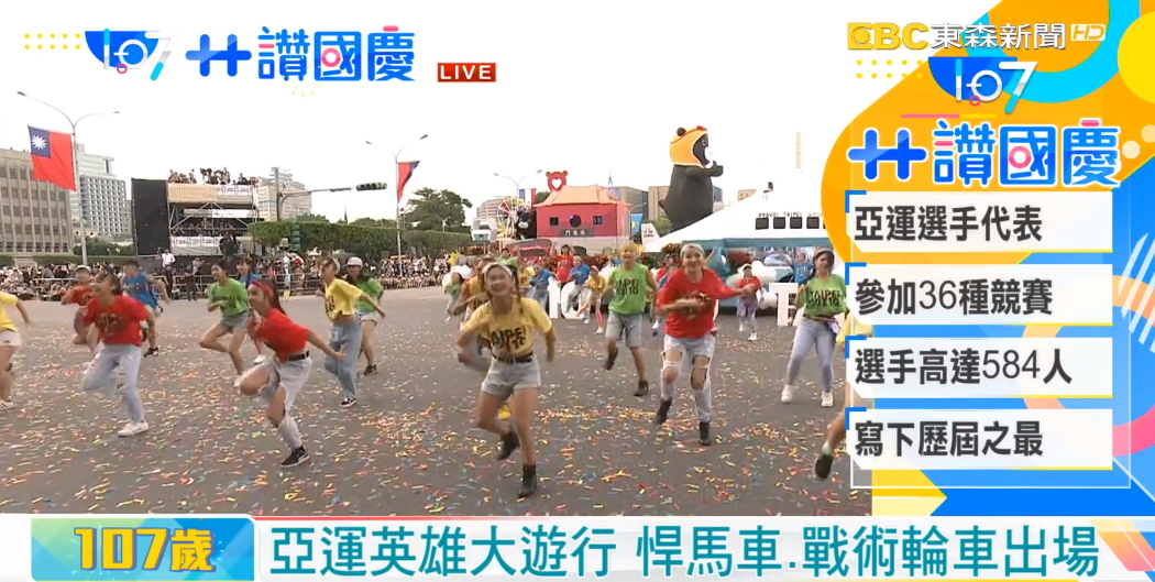 另外,楊昆弼在射擊男子不定向發靶射出世界紀錄奪金,唐嘉鴻在競技體操單槓的金牌、競技體操男子地板的銀牌,梁恩碩在網球女子單打的銅牌也都一再創造驚喜,這些為國爭光的榮耀時刻讓人無法忘懷,這些亞運台灣英雄在國慶日這天參與遊行,讓所有民眾齊聲喝采。