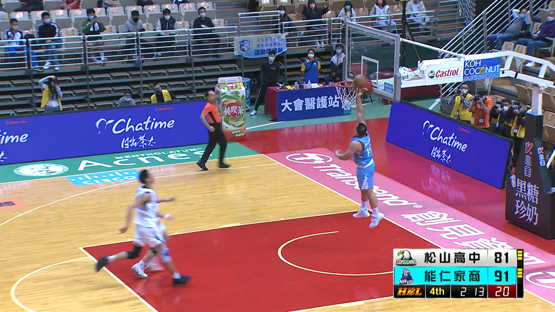 另一場比賽由松山高中對上能仁家商,其中松山巨塔于泓翔,首節表現攻防優異,搶下籃板再放到2分,但衛冕軍能仁家商改變策略,祭出嚴密貼身防守,有效封鎖松山進攻,上半場結束,能仁以37:32微幅領先松山。