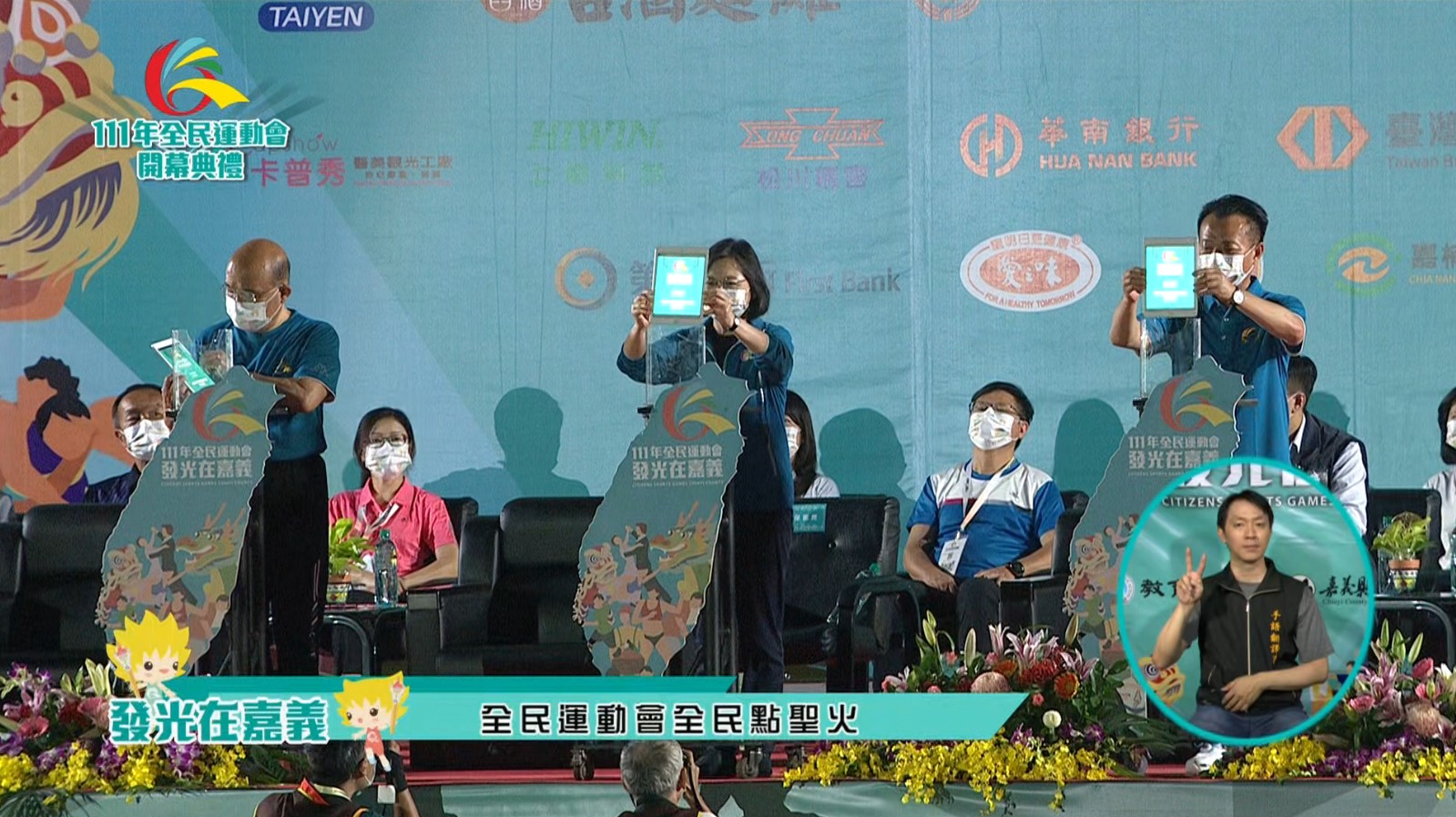 總統蔡英文,行政院長蘇貞昌,和嘉義縣長翁章梁,3個人以平板點燃聖火,象徵全民運正式展開。