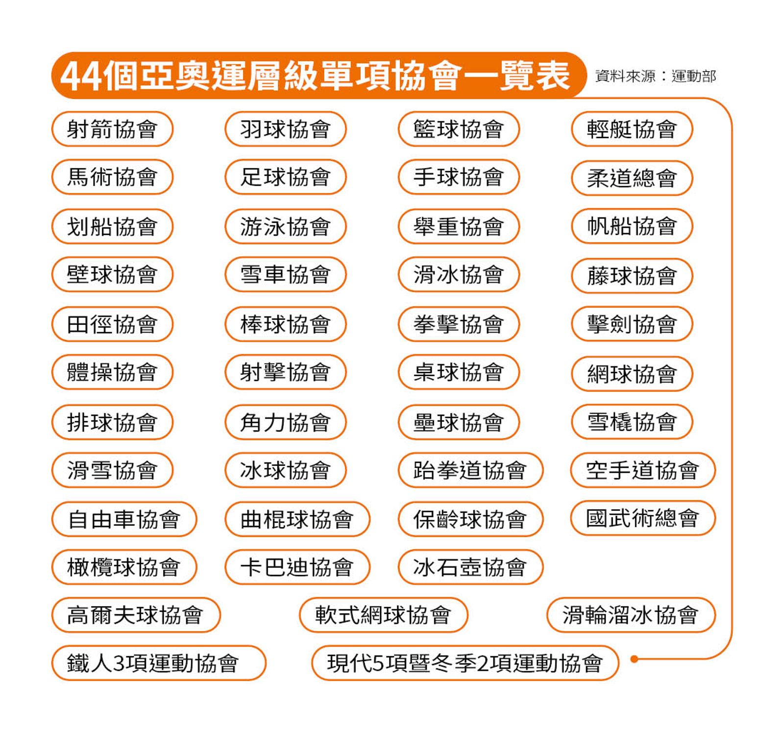 鏡週刊調查,我國目前亞奧運層級的特定體育團體共44個協會,非亞奧運層級則有24個協會,另有帕總、聽體協、智體協及高中、大專體總,由於第20屆亞運明年即將在日本名古屋登場,李洋第一波改革傾向先以亞奧運層級的協會優先推動,再全面推廣至所有協會。
