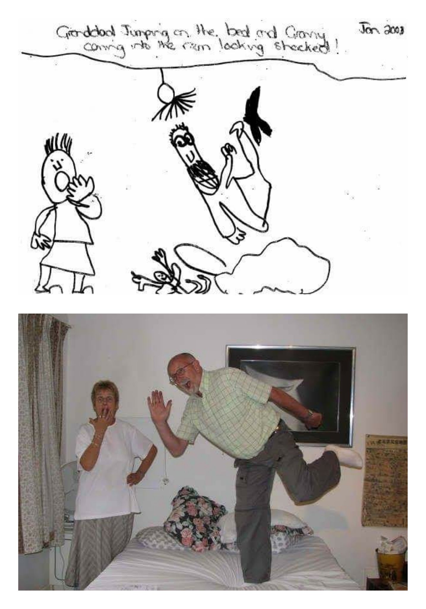 事實上這對老夫妻16歲時就認識,兩人幾乎形影不離,最後搬去南非居住,平時互動就頑皮又有趣。安東尼雅透露,她的女兒過去曾畫了一張「外公在床上跳躍,外婆在一旁被嚇到」的畫送給他們,沒想到幽默的夫妻倆竟然就模仿了畫上的動作,拍了一張照片回送給孫女,令人看了會心一笑。