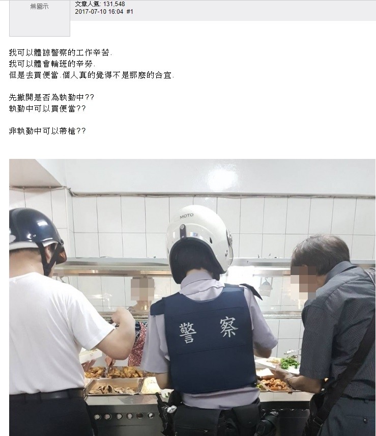 網友10日在《Mobile01》討論區PO文說,「我可以體諒警察的工作辛苦,我可以體會輪班的辛勞,但是去買便當,個人真的覺得不是那麼的合宜。」、「先撇開是否為執勤中?執勤中可以買便當?非執勤中可以帶槍?」最後還PO上一張員警正在自助餐夾菜的畫面。
