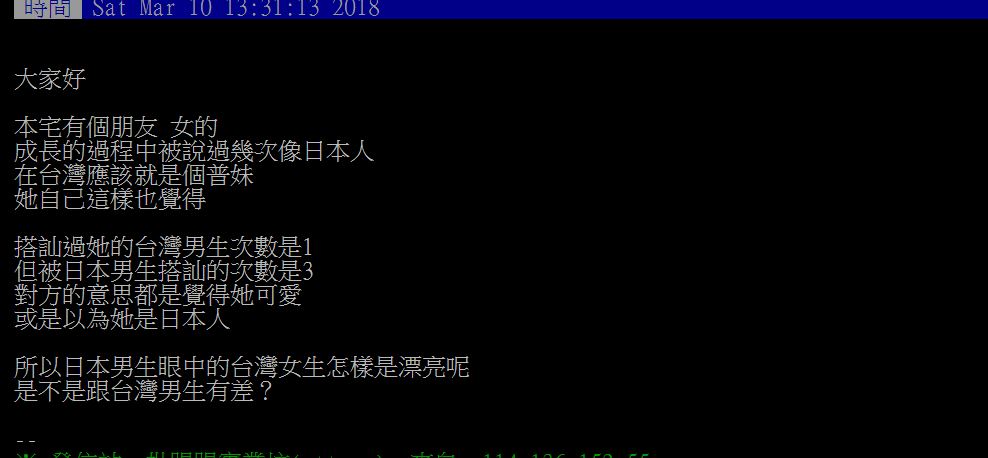 「批踢踢」發文表示,自己有個總被誤認成日本人的女性朋友,她自認為是個「普妹」,在台灣只被搭訕過1次,卻被日本男生搭訕要LINE 3次,對方都以為她是日本人,覺得她長得十分可愛。原PO不禁質疑,台灣女生在日本男生眼中到底如何,日男眼光是否跟台男有差?