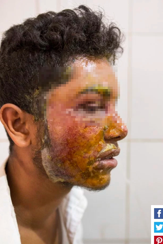 潑酸,導致少年大片皮膚掉落,而且恐怕無法恢復原有俊俏的臉龐,而這也是南亞國家中,少見的男子受害案件。