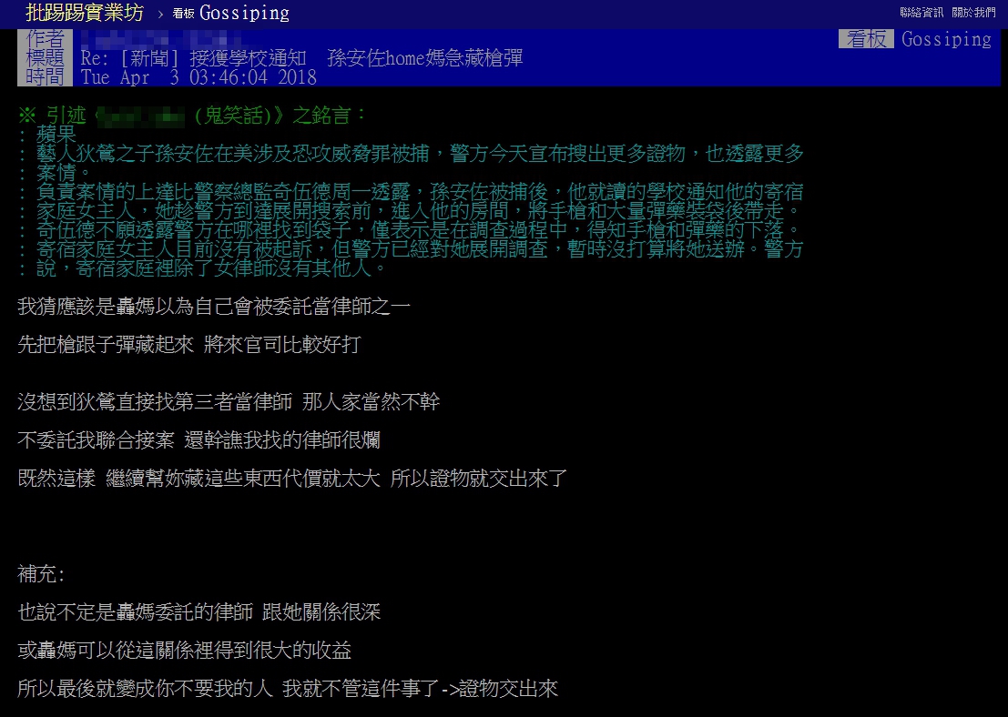 孫安佐,因為涉嫌恐嚇要槍擊校園遭逮捕。隨著事件新事證的搜出,對孫安佐也越來越不利。但許多人納悶的是,Home媽第一時間已經先將1608顆子彈和真槍藏起來了,為何後來消息突然曝光?有網友猜測,也許這一切都是Home媽的報復。