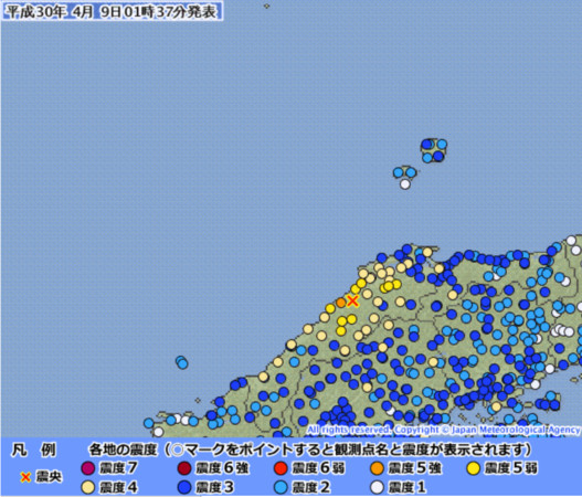 地震,深度約8.54公里,大田市被偵測出高達5級的強震,川本町、島根美郷町、出雲市、雲南市震度也有5弱。這起屬於淺層地震,造成部分住家、商店窗戶破裂,傳出有4人受傷,171人緊急避難。