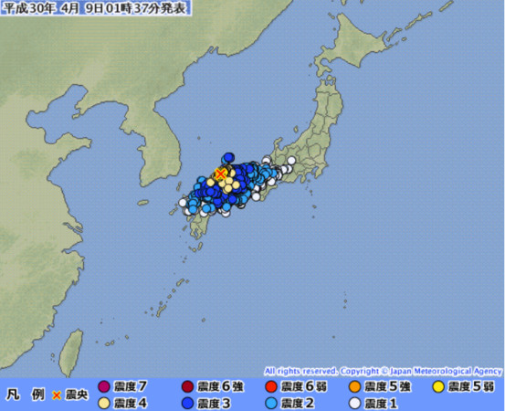 日本島根縣於當地時間周一凌晨1時32分(台灣時間9日0時32分),發生芮氏規模6.1