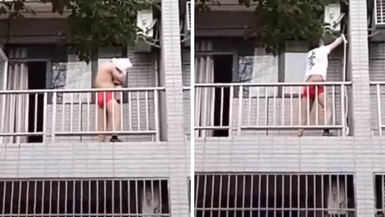 《流氓葷笑話》12日PO出這段長1分2秒的影片,只見一名體型微肉的男子,慌張地從室內跑到陽台外,他全身只穿著一條紅色內褲,上班身打赤膊,手中則抱著一坨衣物,疑似因為事出緊急,連衣服都來不及穿。