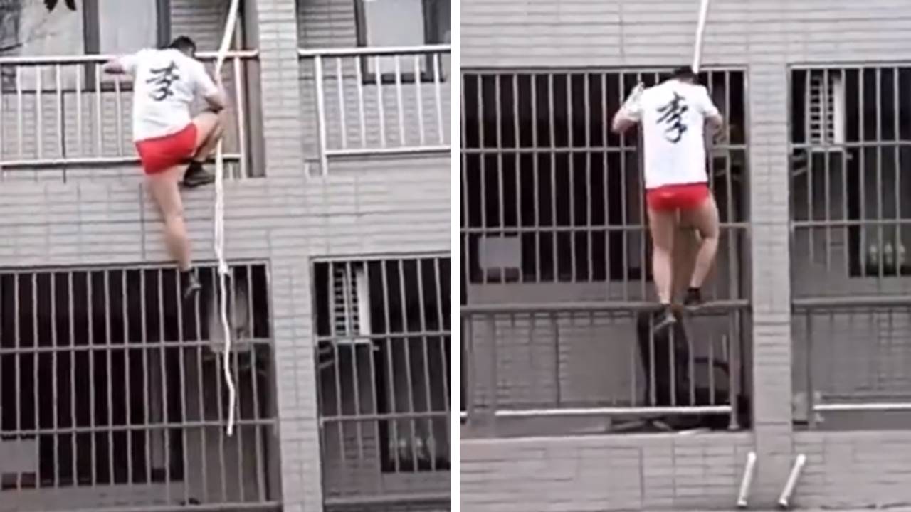 接著,男子將手中物品朝陽台外一扔,套上印有大大「李」字的白色上衣後,靠著預先備好的繩子,搭配純熟的高超技巧,迅速邊垂降、邊扶著鐵窗攀爬至一樓,撿起散落在地面的衣服後,隨即逃跑,整個「下樓」過程只花費25秒,迅速到讓網友全看傻。