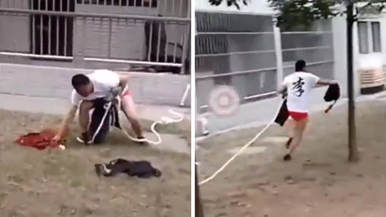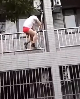 一看就知道是常客!微博近日瘋傳一段落跑影片,一名男子穿著大紅色內褲,急忙從屋內往外衝到陽台,再迅速垂降至一樓接著用跑百米的速度拔腿狂奔,行雲流水一般的動作,讓人驚呼連連。