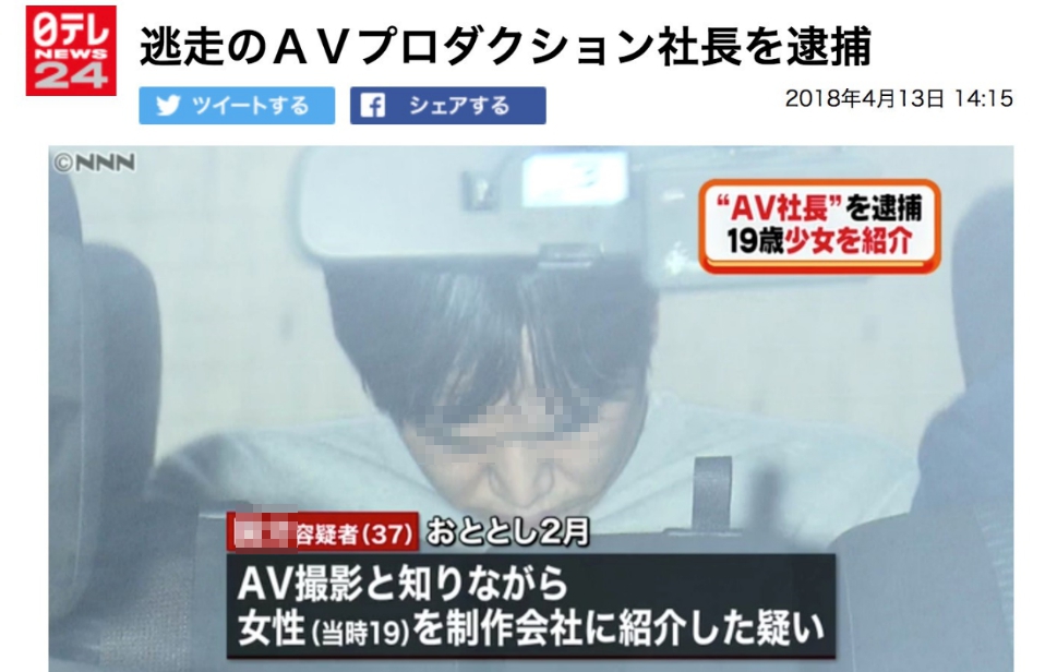 據日本《朝日新聞》報導,經紀公司「neos」的37歲社長2016年和一名19歲女學生簽定合約,事後卻和其他3名友人密謀將合約中的「不拍AV」改成「可以拍AV」,還派人強押女學生到片場,強迫她進行拍攝,惡行被揭發後警方已於11日將4人全逮捕到案。