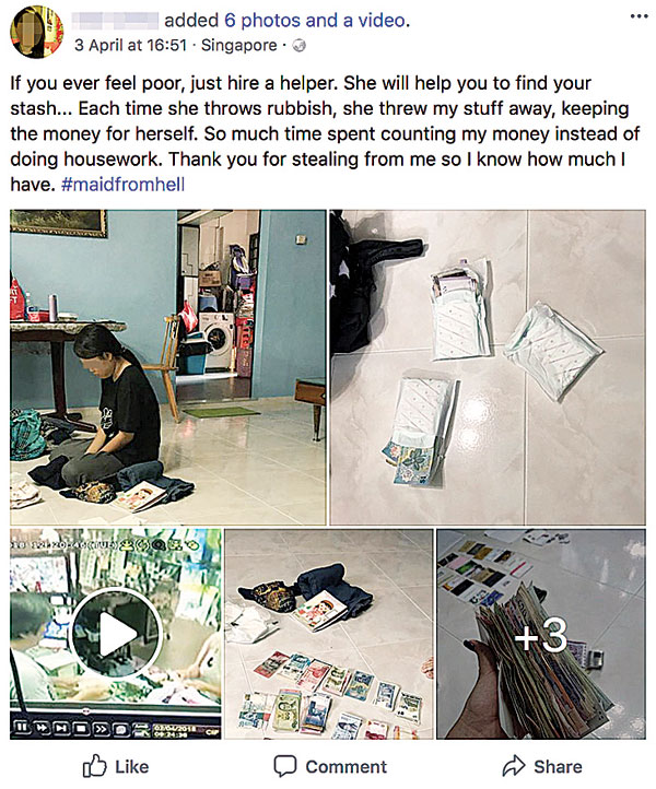 從照片中可見,女傭低頭癱坐在地,表情害怕不敢吭聲,前面則是擺了成疊的7國鈔票,有新加坡幣、美元、歐元、英鎊和人民幣等等,讓雇主痛批「她每天並不是在做家事,而是在數我的鈔票」,還「謝謝」女傭讓她知道自己多有錢。