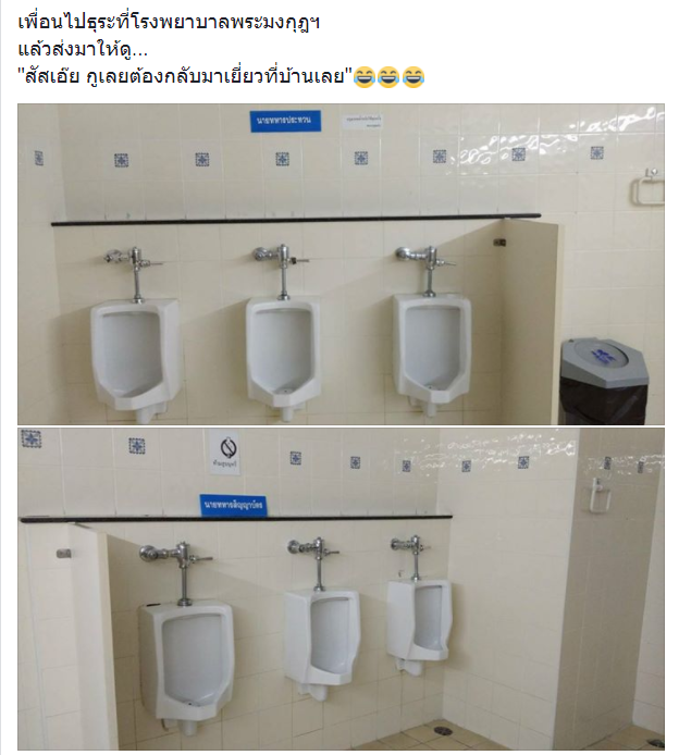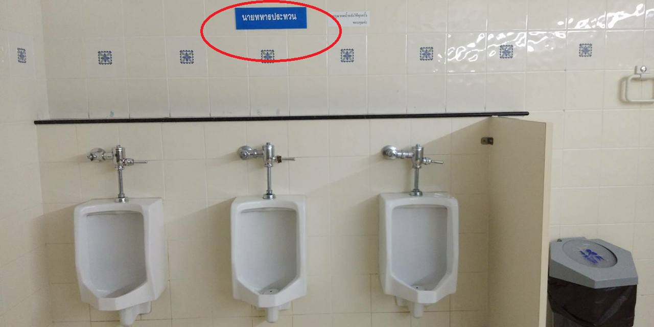 內急,匆匆前往附近的曼谷第六王醫院(Phramongkutklao Hospital)借廁所,但他一進廁所卻看見小便斗按等級被隔開,每個上方都貼著兩塊藍底白字的標示牌,一塊寫著「非委任軍士」,另一塊是寫著「委任軍士」,男網友表示因為朋友不屬於任何級別,最後不敢在那裡尿。