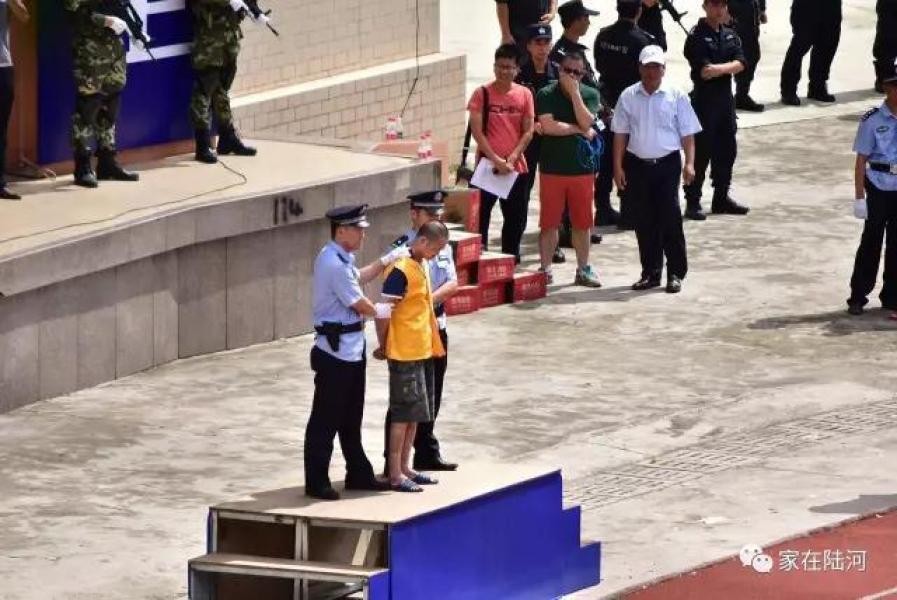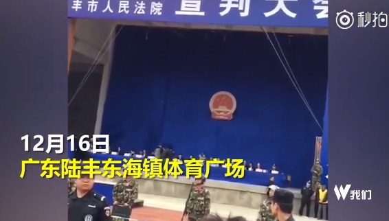 《新京報》報導,廣東省汕尾市、陸豐市的法院,在東海鎮體育廣場進行聯合宣判大會,12名嫌犯當中有10人因為犯下製作、販賣毒品或是搶劫殺人重罪,被宣判死刑,大會過程中嫌犯必須一一上台聽判,而一但被判刑後就送上露天警車,直接送往刑場處決。