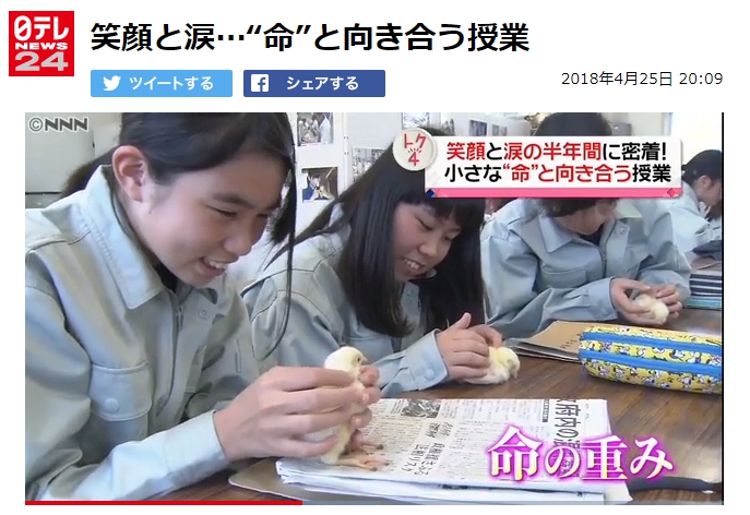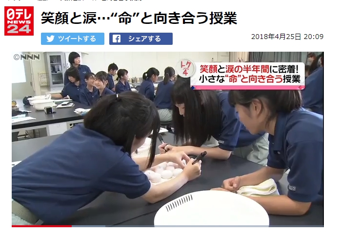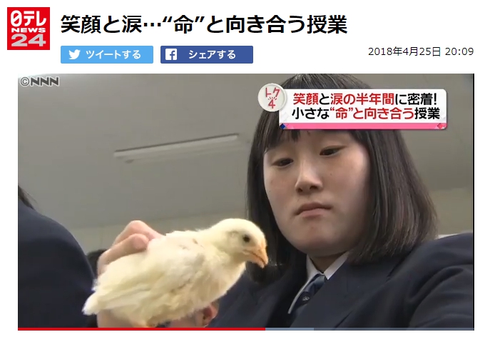 生命教育本身就是殘忍的嗎?日本島根縣出雲農林高中,特別規劃課程,讓學生親自孵化小雞、養大,最後再親手將雞宰來吃,過程中學生從迎接新生命的喜悅,變成淚流滿面的離別傷感,從中了解生命的可貴,不過外界對此課程反應兩極,不少人認為這樣太殘忍,擔心學生內心會留下陰影。