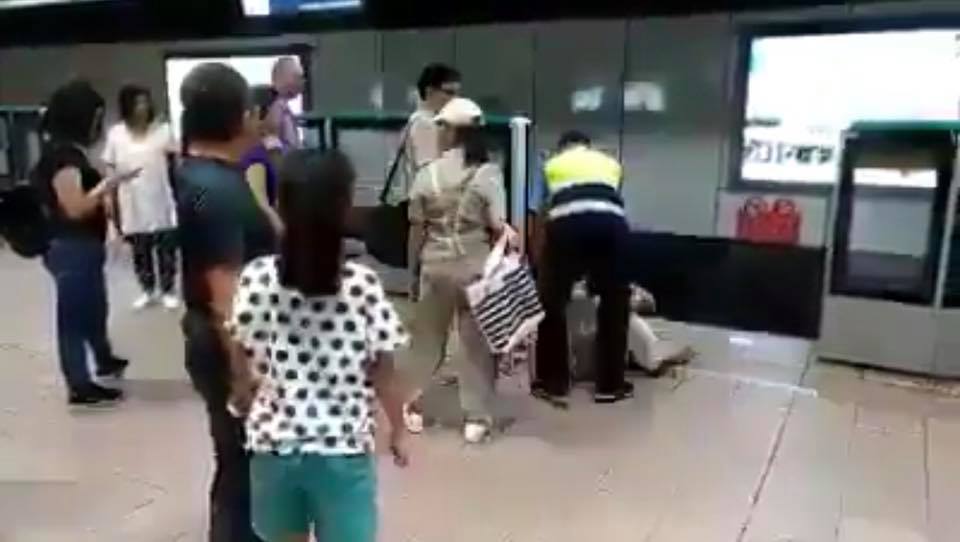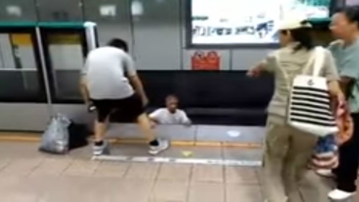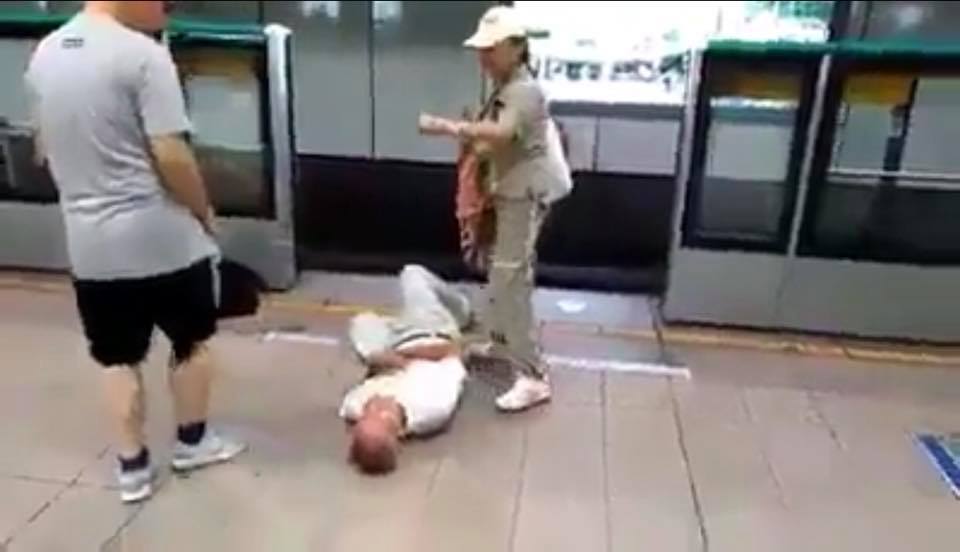 再來看到影片,一開始老先生站在鐵軌中,許多人嚇得走到閘門邊,要老先生快點爬上來,這時戴帽子的灰衣婦女大喊「你有本事站在那裡」,又一個箭步往前,踹了老先生一腳。一名男路人擔心發生輾壓意外,趕快將老先生拉上鐵軌。沒想到灰衣婦人竟然和路人吵架,見誰就跟誰吵架,引起保全注意。