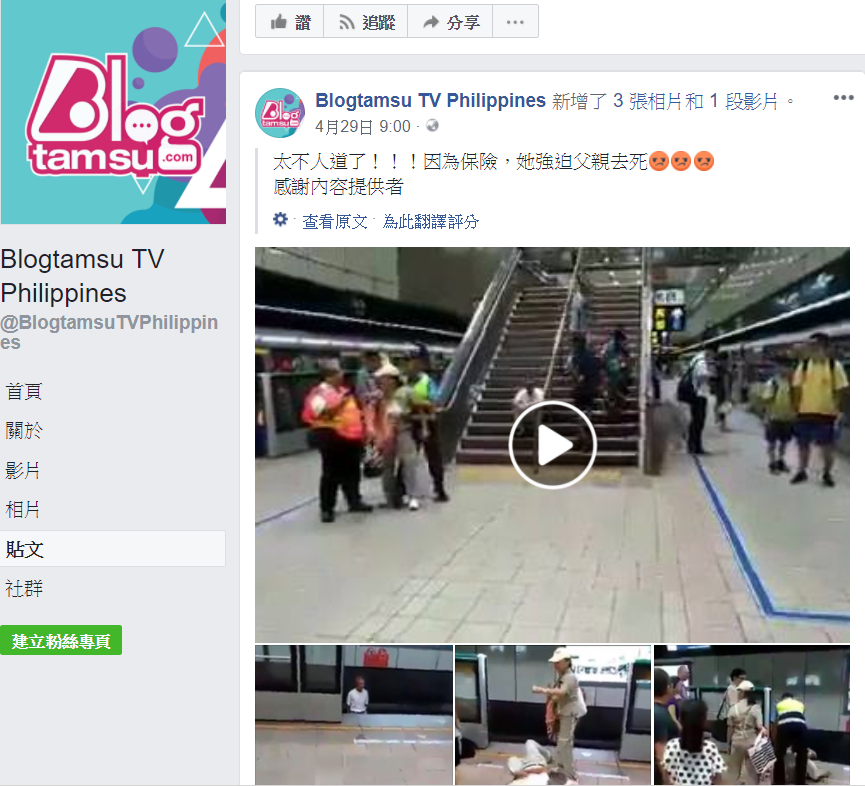 菲律賓粉絲團《Blogtamsu TV Philippines》在當地擁有不小名氣,貼出影片經常在當地引起不少討論。上月29日卻出現一支和台灣有關的影片,內容寫著:「太不人道了!!!因為保險,她強迫父親去死,感謝內容提供者。」只見一名穿白衣的老先生站在軌道上,下一張照片則換成老先生躺在地上,一旁還有一名戴著帽子穿灰衣的婦女,第三張照片則有一群人圍觀,捷運保全趕來拉住老先生,婦人還站在一旁東張西望」。